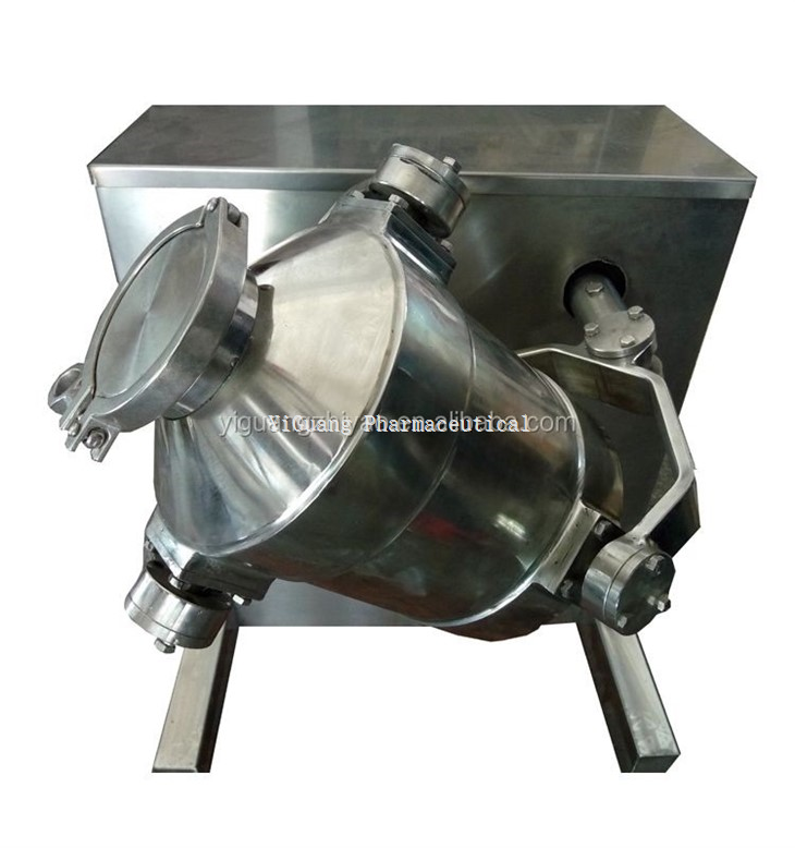 У току рада машине, услед вишесмерног кретања бурета за мешање, проток и дифузија различитих материјала се убрзавају током процеса мешања, а истовремено долази до сегрегације и акумулације специфичне тежине материјала. центрифугалном силом опште мешалице се избегавају. Не постоји мртви угао у мешању, што може ефикасно осигурати најбољи квалитет мешаних материјала. Структура: Машина се састоји од базе машине, система преноса, електричног управљачког система, механизма за вишесмерно кретање, бурета за мешање и других компоненти. Буре за мешање које је у директном контакту са материјалом је направљено од нерђајућег челика, а унутрашњи и спољашњи зидови бурета су полирани. У потпуности у складу са ГМП захтевима.